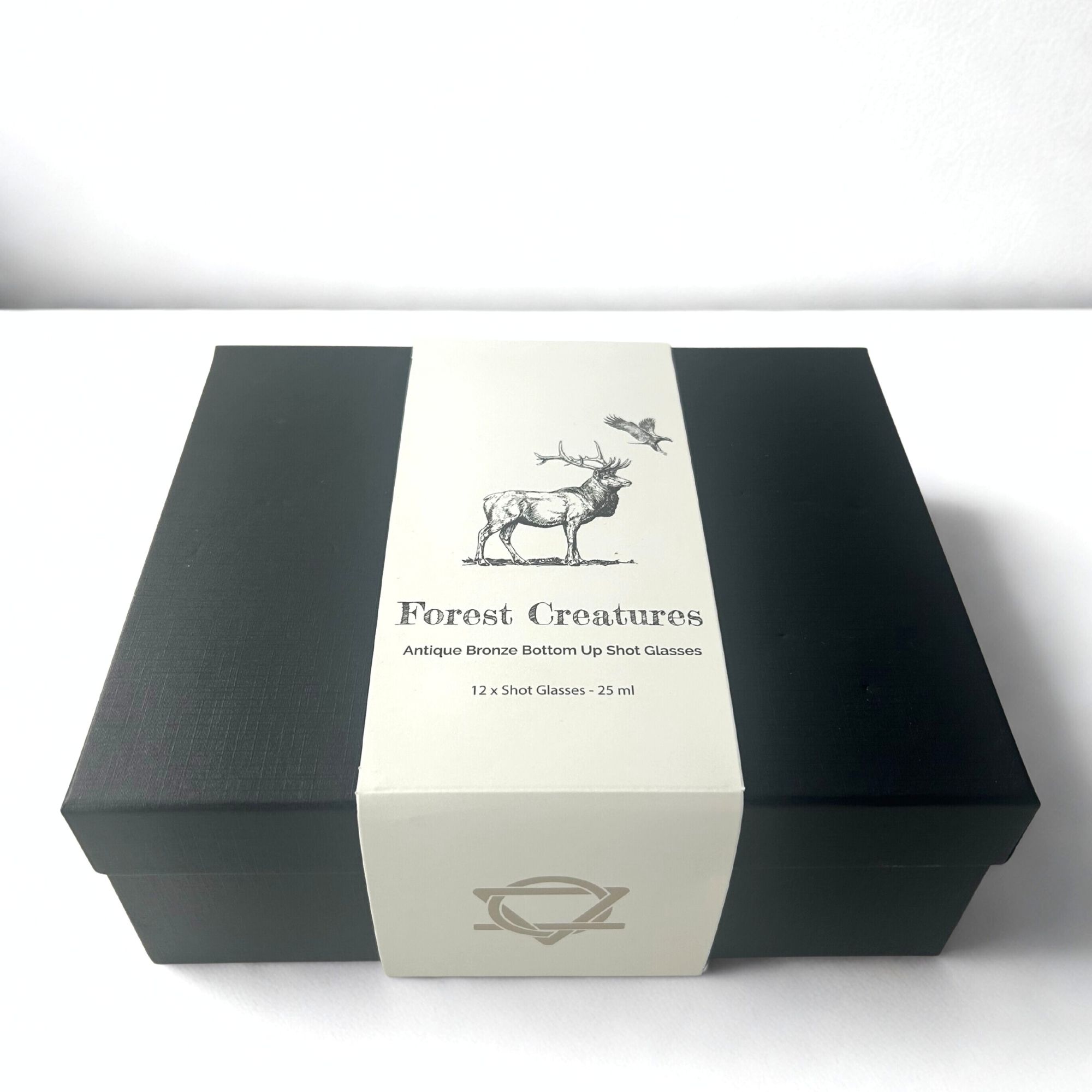 Conjunto de regalo de 12 vasos de chupito Bottom Up (25ml) – Bosque y Criaturas Místicas – Bronce Antiguo